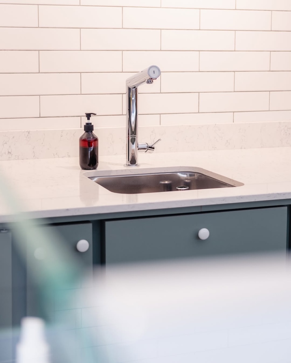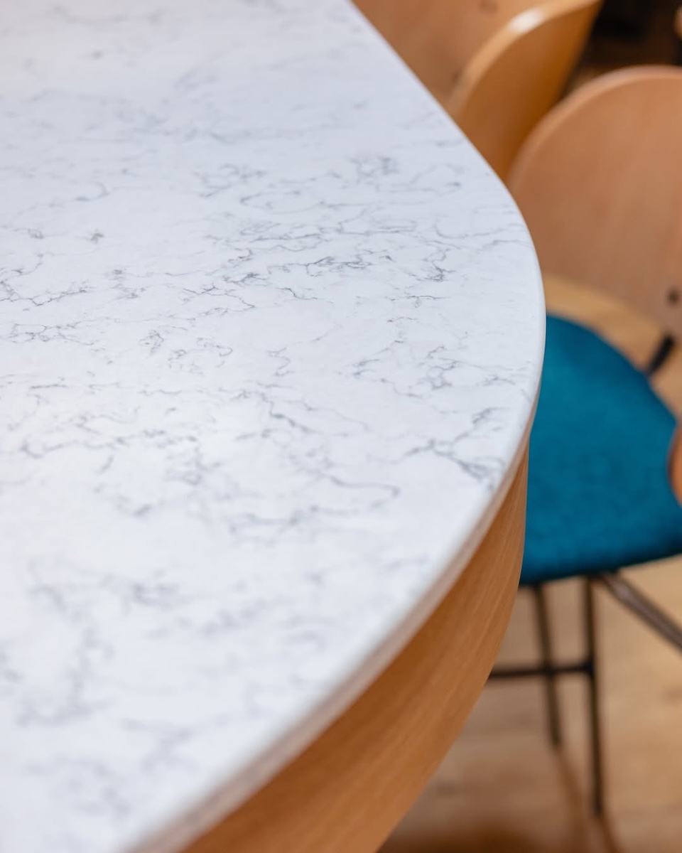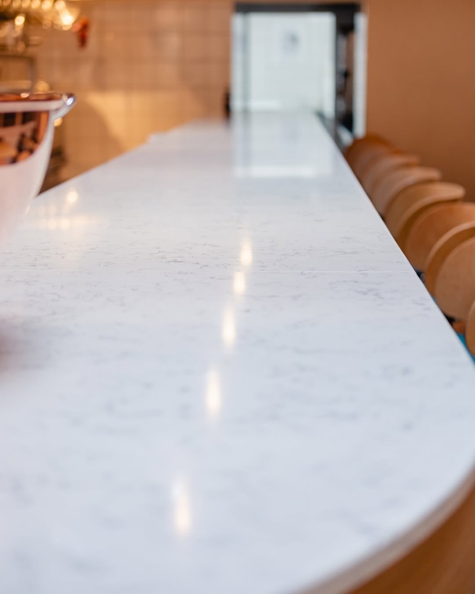 → Pour ce projet, nos ateliers ont travaillé le Silestone White Arabesque, une finition poli mêlant subtilement blanc et gris, parcourus de veines sombres pour un effet marbré audacieux.